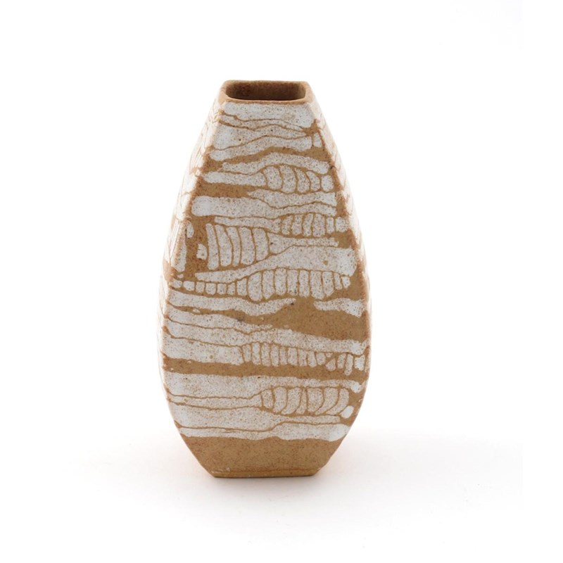 a stoneware swollen vase, square section, resist decorated with strata design incised Carolyn Genders 14cm. high