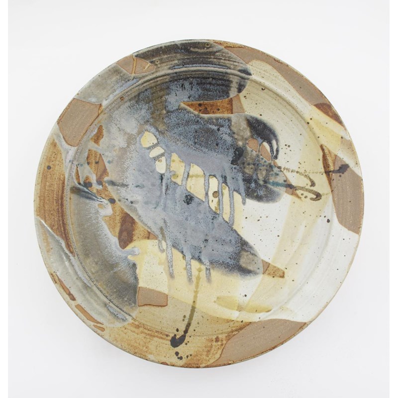 a large stoneware charger, painted to the well with abstract splashed and brushed design in colours impressed seal mark, Peter Dingley label 49cm. diam.