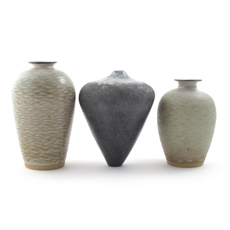 a stoneware vase, shouldered form with everted rim, covered to the foot with a textured ash glaze, another smaller and a stoneware vase by Ann Kempley, painted JG monogram 21cm. high