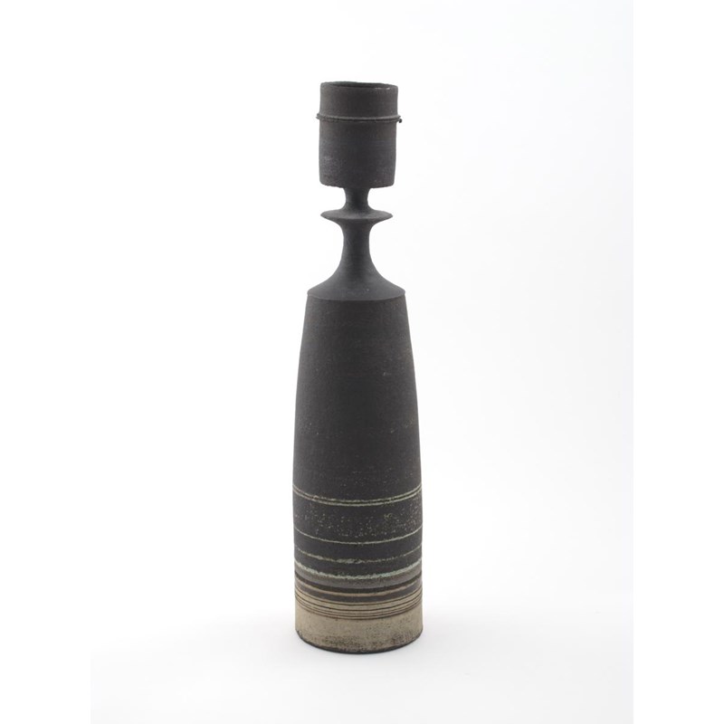 a tall waisted cylindrical vase form, with incised bands to the base, covered in matt black and ochre glazes incised Hugo 51cm. high