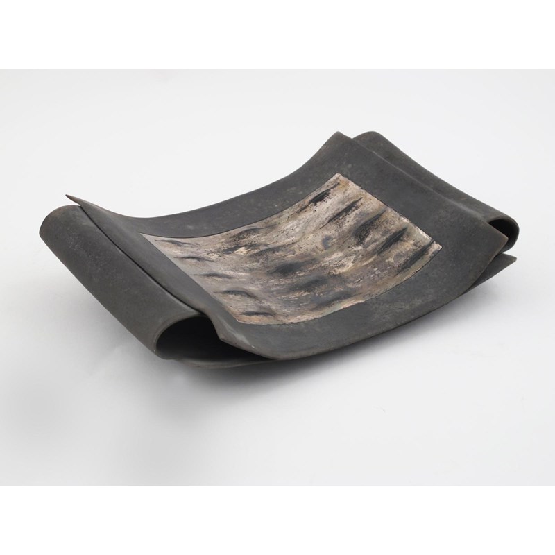'Platter with Silver Leaf' a stoneware vessel, the matt back body applied with rectangular panel of silver, impressed seal mark, 31cm. wide