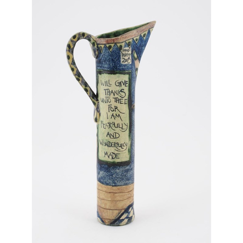 'I Will Give Thanks..' a slender pottery ewer, 2005, painted with an acrobat performing a handstand, the reverse incised with a verse, in colours painted signature and date to neck, 30cm. high