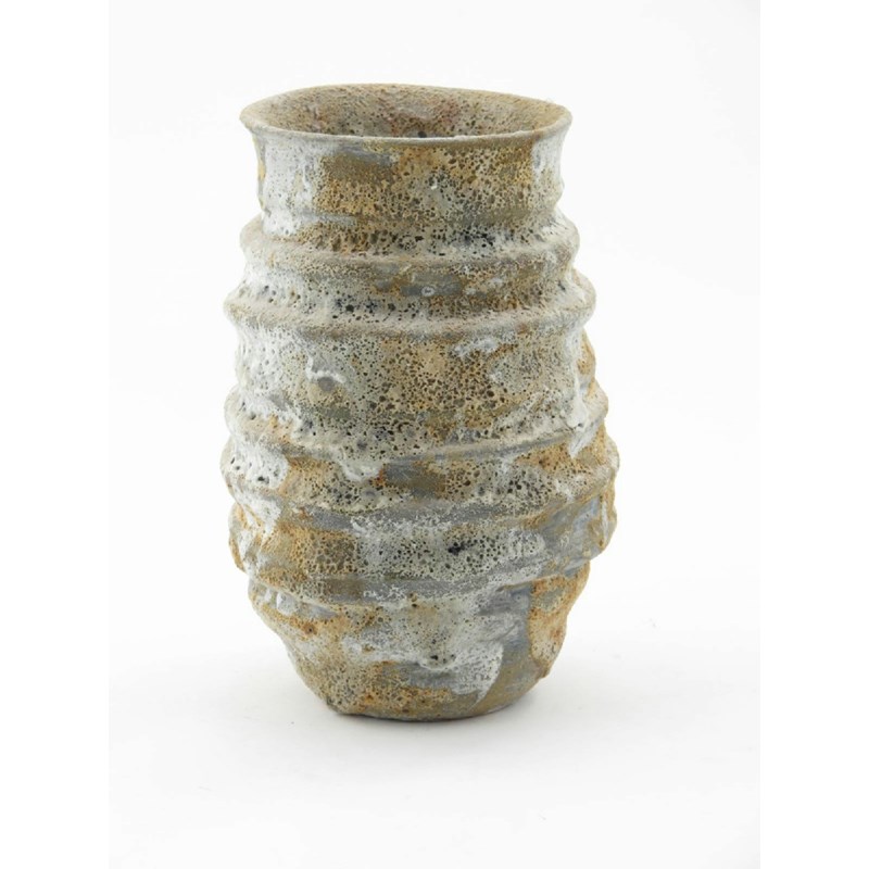 a ribbed cylindrical vase, covered in an off white volcanic glaze impressed seal mark 25.5cm. high