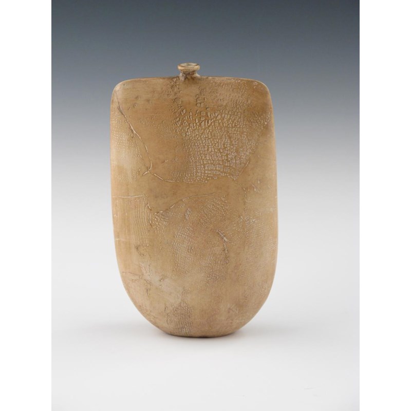 a raku sack form vase, covered in a textured buff glaze incised marks, impressed seal mark, 30cm. high