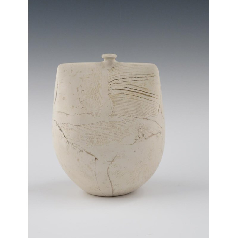 a raku sack form vase, dated 1988, covered in a textured white glaze incised marks and date, impressed seal mark, 22cm. high