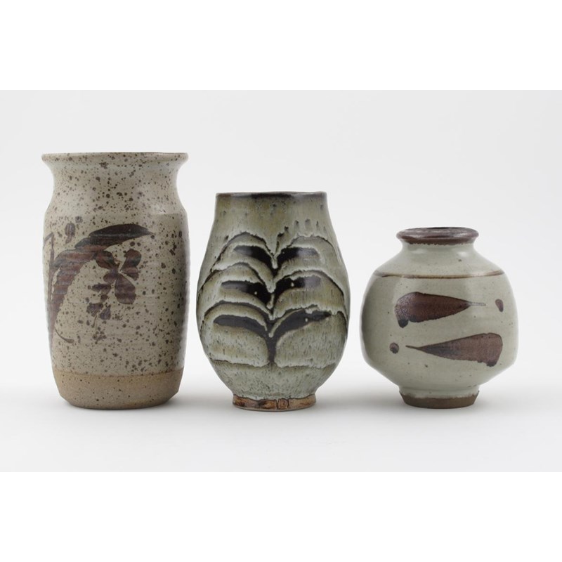 a Lowerdown Pottery vase, resist decorated with a willow tree design, a Joe Finch vase decorated with simple tenmoku brush design and another vase impressed seal marks 16.5cm. high