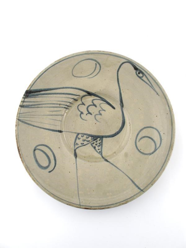 a Wenford Bridge charger, painted with a wading bird, in blue on an ash glaze impressed seal marks, 40cm. diam.