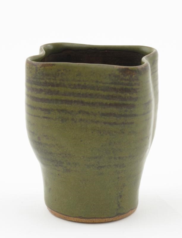 an earthenware vase, flaring form with pinched, squared rim, glazed to the foot in green impressed seal mark 10cm. high