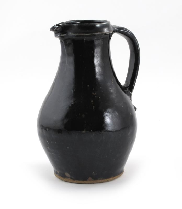 a stoneware fluted jug, covered in a rich tenmoku glaze incised WM monogram to side 28cm. high