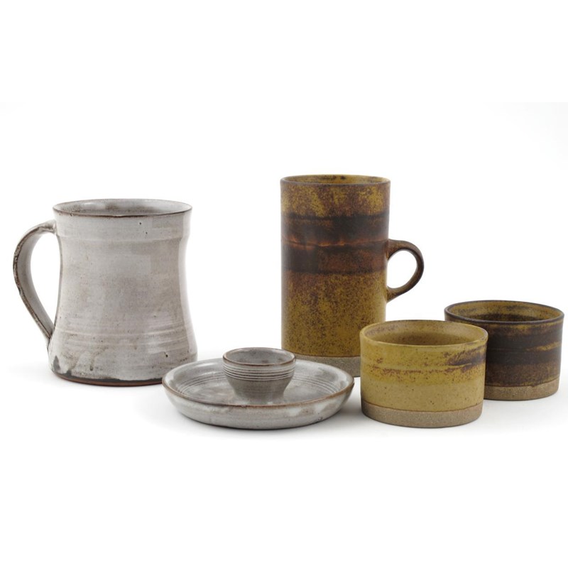 a Lowerdown Pottery tin-glazed earthenware egg cup and tankard, and a collection of studio pottery including work by Robin Welch and Guy Sydenham various marks