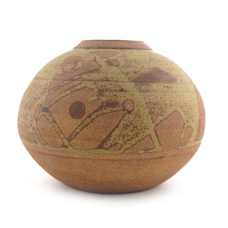 a stoneware ovoid vase, painted in resist with geometric panels in rust on an ochre ground impressed seal mark 18cm. high