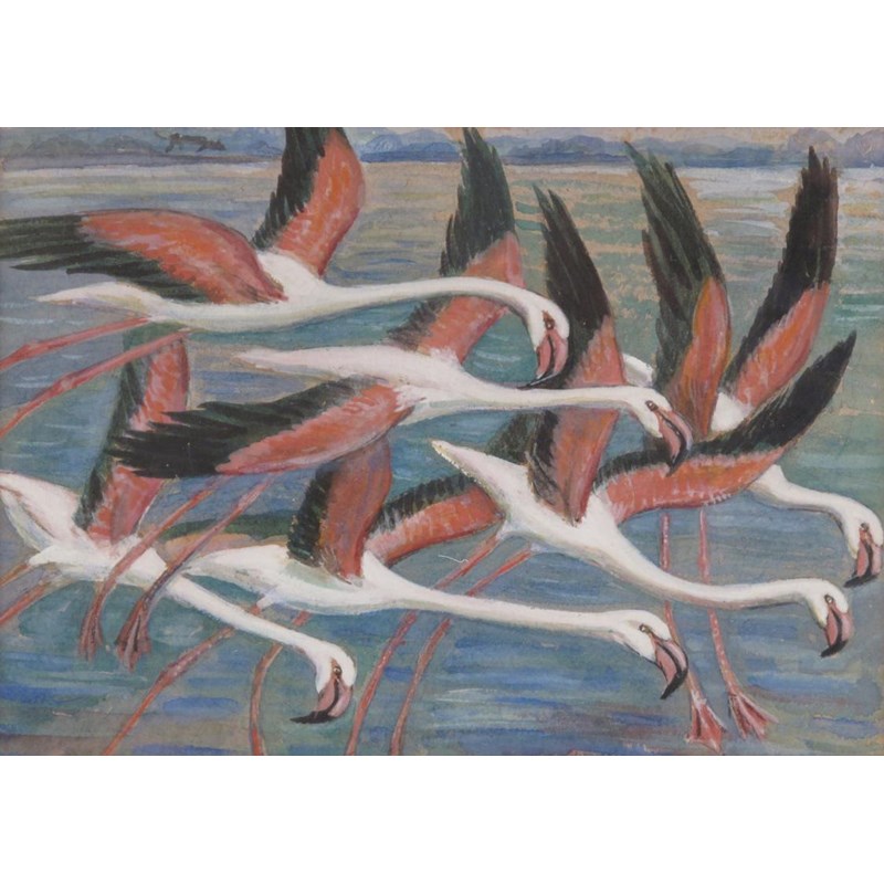 ‡'Flying Flamingos in Carmargue' a watercolour design for a pottery panel, by Stella R Crofts, framed applied paper labels to the reverse, one inscribed in ink 'To Miss Sargeant with happy memories Doris Crofts, July 1958 image 24.5 x 17cm.