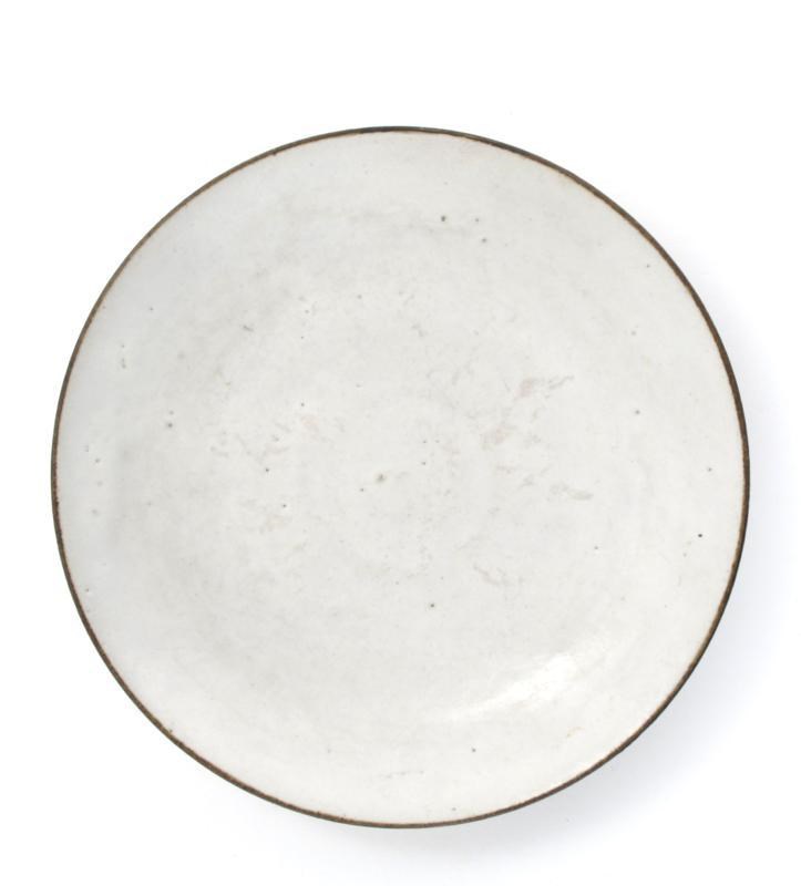 a stoneware plate, glazed off white with bronze rim, impressed seal mark, minor professional restoration to rim 16cm. diam.