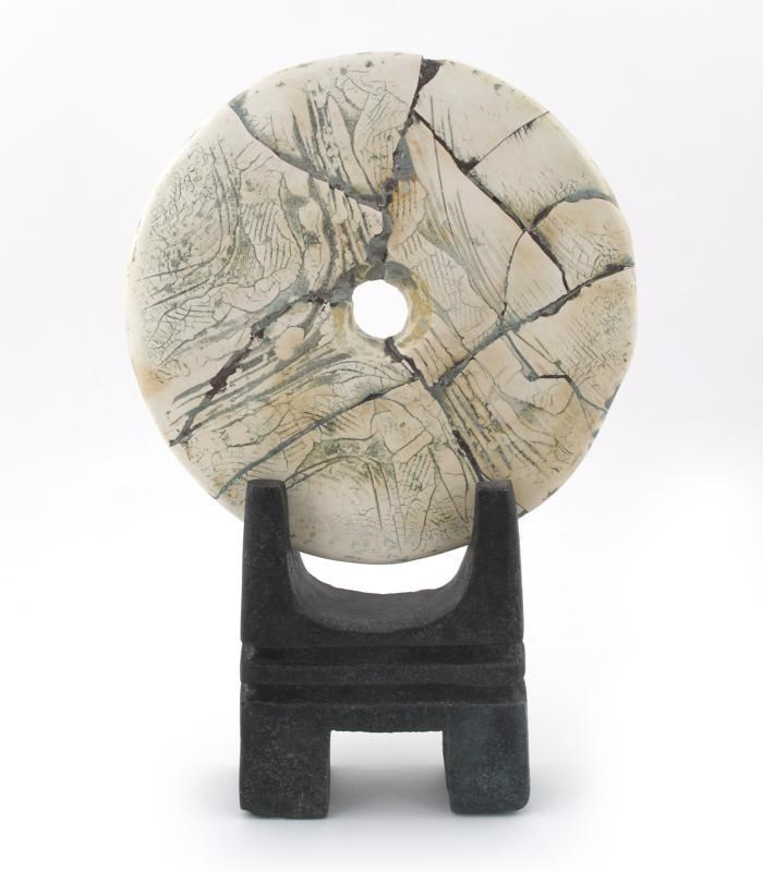 a porcelain disk form, on raku base ink signature Peter Hayes 201143cm. high