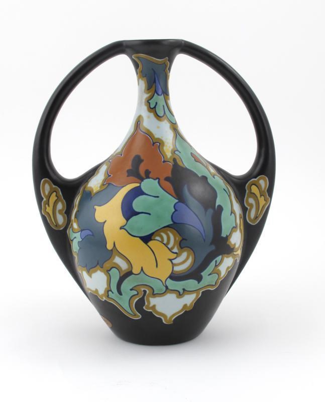 A Gouda, Holland Regina Kastor Art Nouveau twin-handled vase, painted in colours on a black ground painted marks 29cm. high