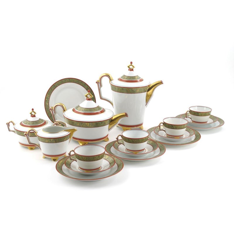 A Rosenthal porcelain tea service for twelve, pattern no. 3622, printed with bands of flowers and foliage in gilt on a green ground, between coral red borders, comprising; teapot and cover, hot-water pot and cover, twelve cups, saucers and side plates and two sandwich plates printed number Thomas Bavaria marks, minor damages hot water pot 26cm. high