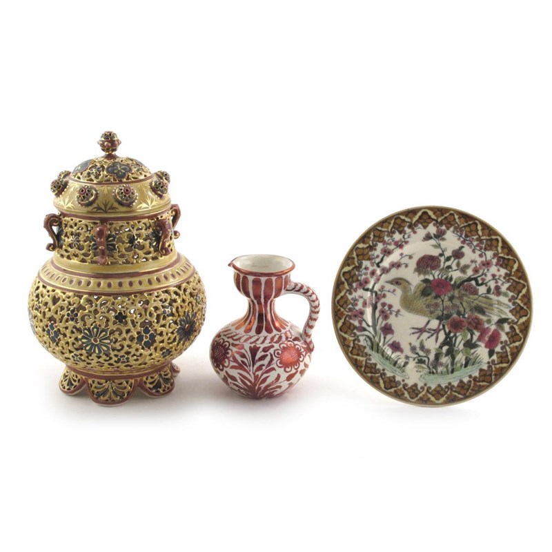 A Cantagalli pottery jug, painted with stylised flowers in ruby lustre on a white ground, and a Zsolnay Pecs plate and a pierced pottery vase and cover painted cockerel mark, 14cm. high
