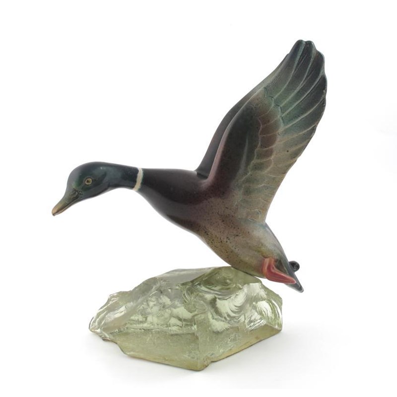 'Mallard Duck Flying' a French pottery figure on a glass base