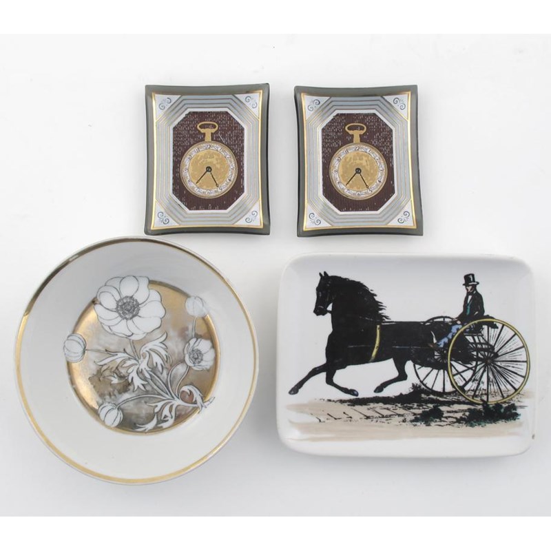 A Fornasetti ceramic dish, rounded rectangular section, printed with a horse and trap design, another Fornasetti circular dish and two glass dishes decorated with pocket watches factory marks, 14cm. wide