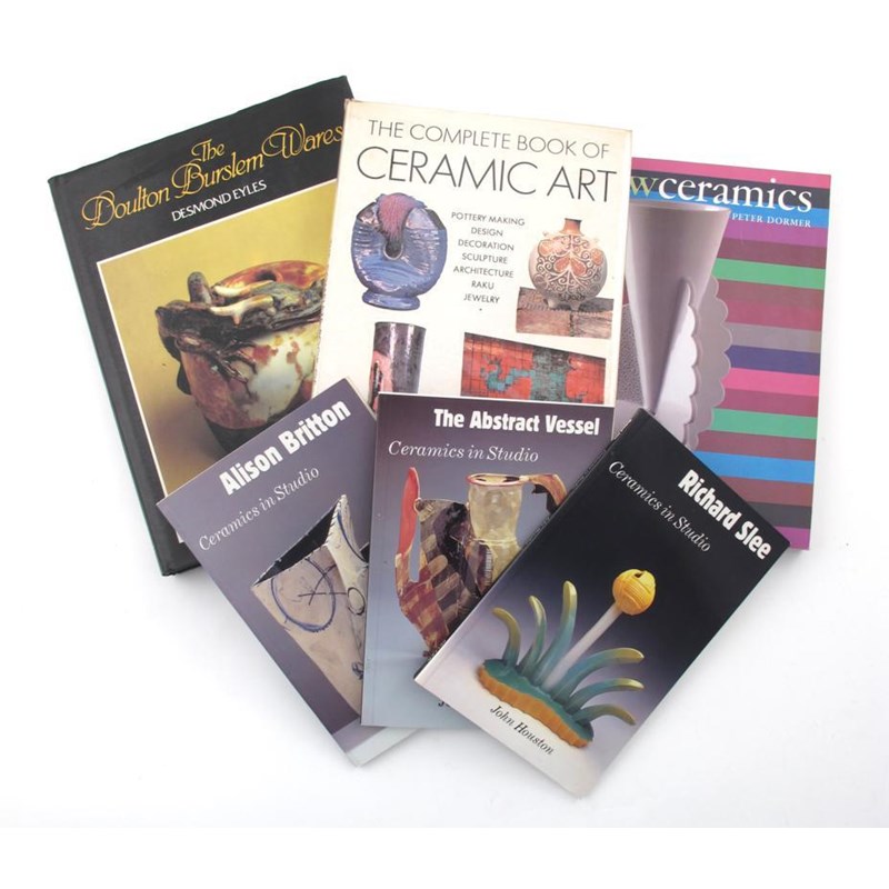 A collection of books on pottery and contemporary ceramics, including titles on Richard Slee, Alison Britton, Janice Tchalenko, Sam Haile, Elizabeth Fritsch, Glenys Barton, Rye Pottery, Doulton and others