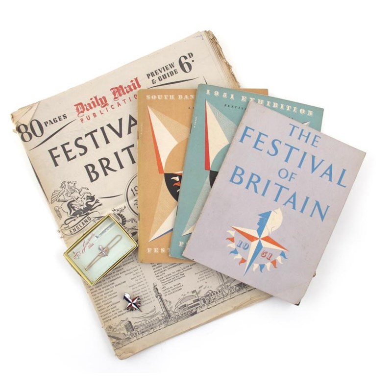 A small collection of Festival of Britain memorabilia, comprising; an enamel badge, tie clip in presentation box, three guide books and a copy of the Daily Mail Festival of Britain publication
