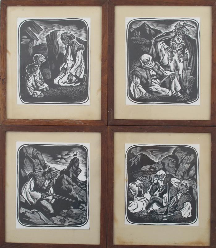 A set of four scraperboard designs by Horowicz, framed, signed in the print 18 x 15cm.