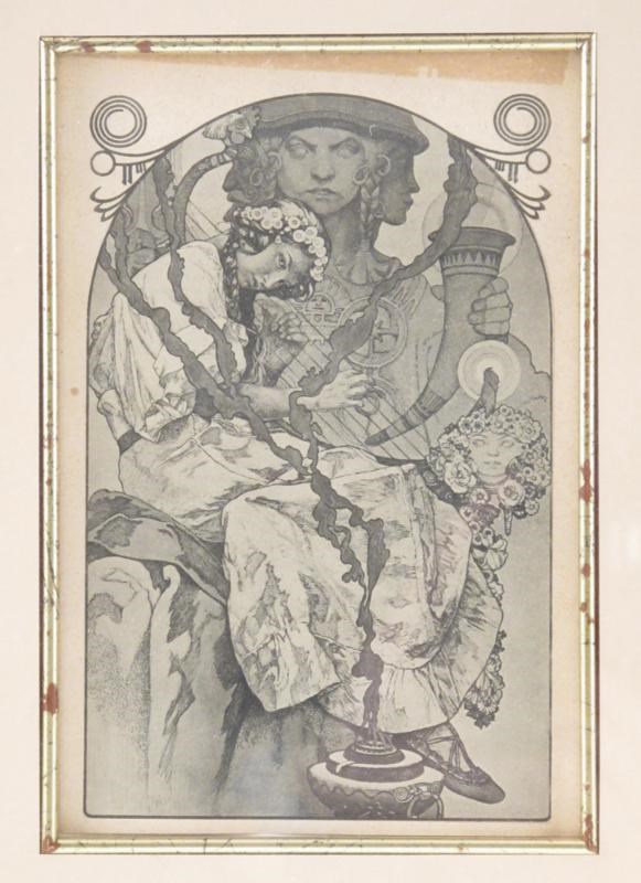 'A Girl with a Harp' a heliogravure by Alphonse Mucha, framed, signed in the print Mucha image 16.5 x 10.5cm.