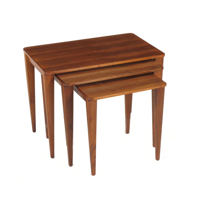 A Gordon Russell Workshops nest of three teak tables, rounded rectangular tops, stamped marks, 61cm. wide