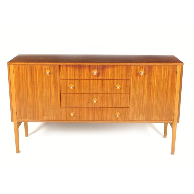 A Gordon Russell Limited dining room suite, designed by Trevor Chinn comprising; sideboard, extending table and six chairs , sideboard 153cm. wide