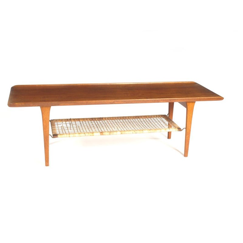 A Danish teak coffee table designed by Hans Wegner, rectangular with upturned sides, cane shelf applied label to underside 151cm. long