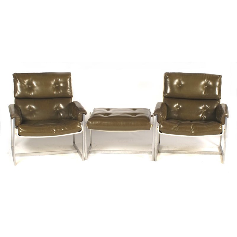 A pair of Eglin bent ply and chrome armchairs, with leather padded seats, and a stool 82cm. high