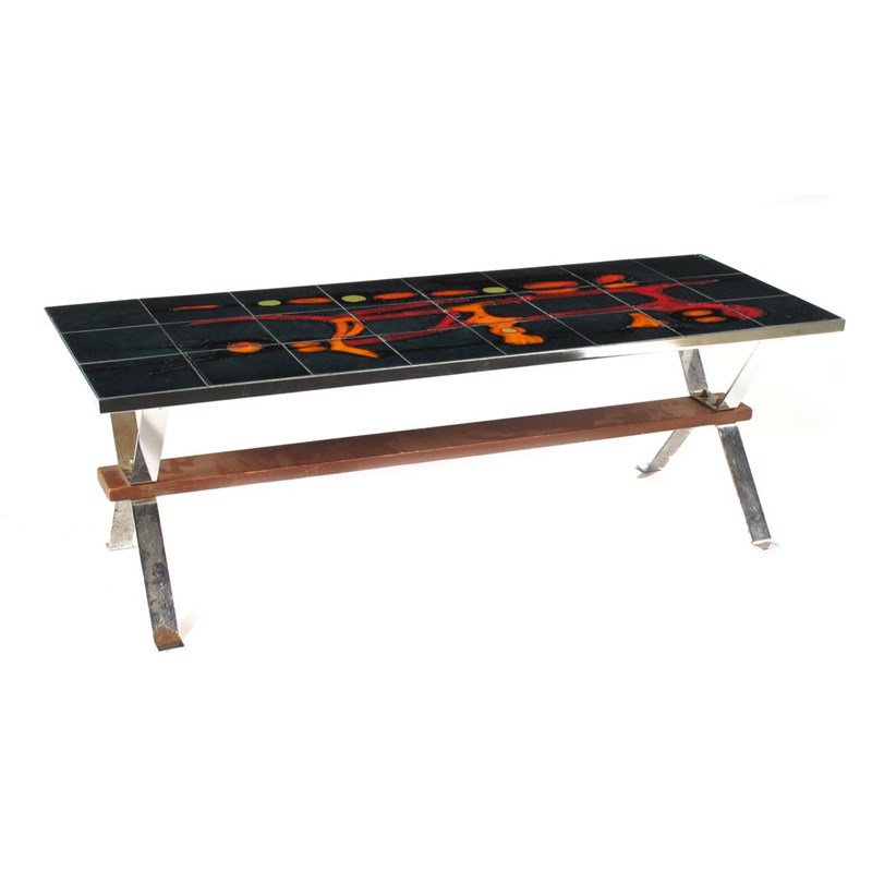 A chrome framed tile topped table, rectangular with abstract design top, signed Roci 123 47cm.