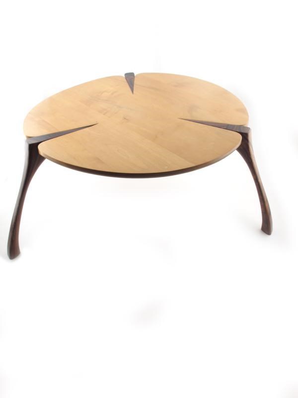 A rosewood and beech low table, the shaped, round top cut with three flaring legs unsigned 78cm. diam.