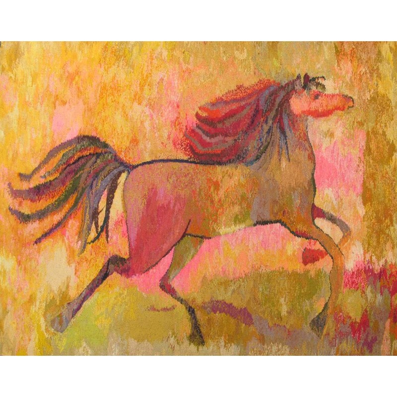 An embroidered wall hanging of a galloping stallion, 1970s, in shades of yellow and pink unsigned 148 x 130cm.