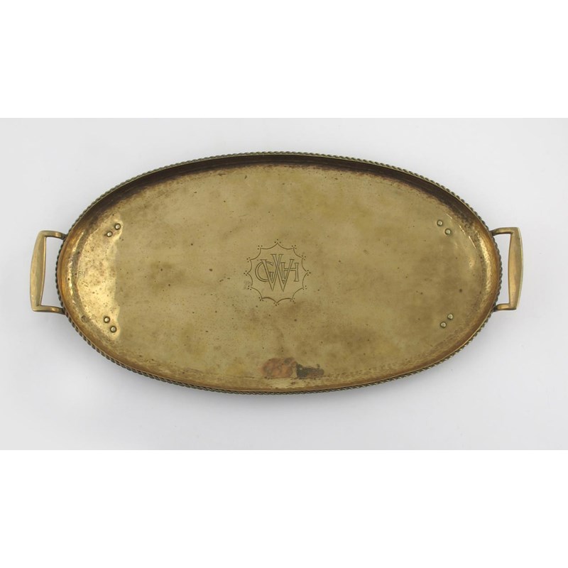 A Hugh Wallis brass twin-handled tray, elliptical form with rope-twist border, stamped monogram to the well, stamped HW monogram 56cm. wide