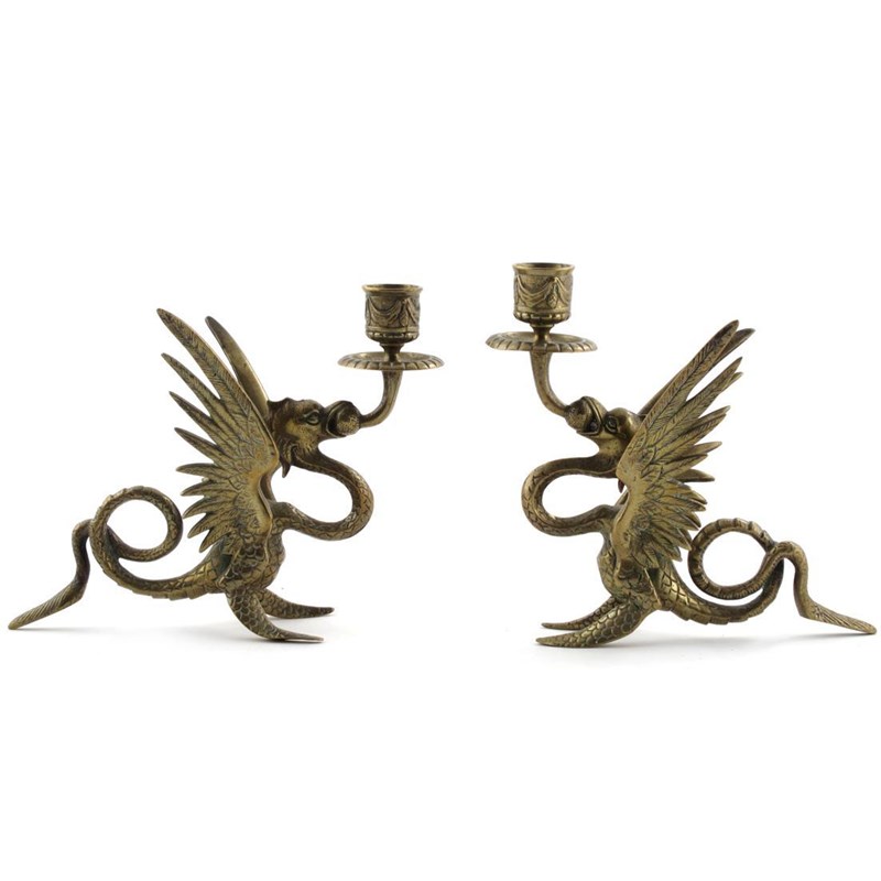 A pair of cast brass candlesticks, each modelled as a dragon creature unmarked 17cm. high