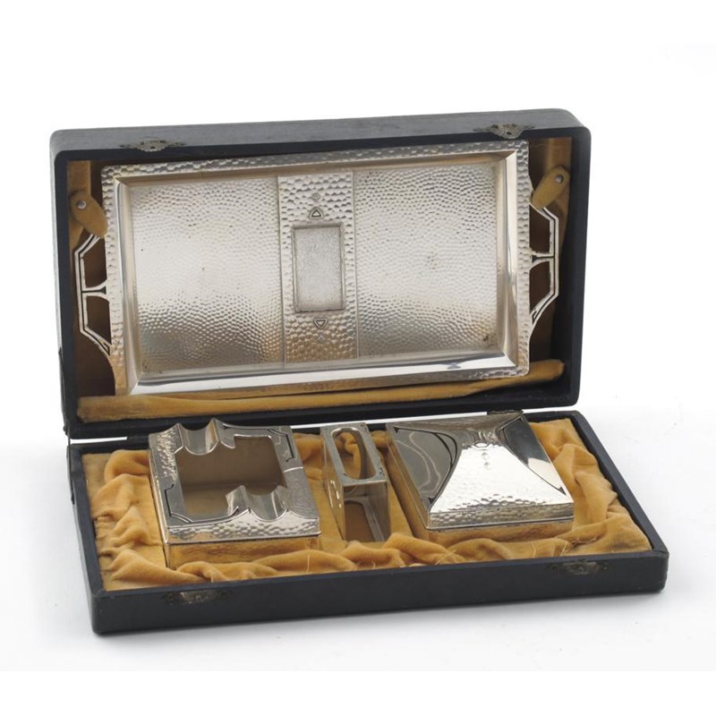 A continental Secessionist electroplated metal smokers set, hammered finish with black enamelled detailing, comprising twin-handled tray, ashtray with glass liner, cigarette box and cover and match box cover, in fitted retailers case cast yacht mark to the tray tray 23.5cm. wide