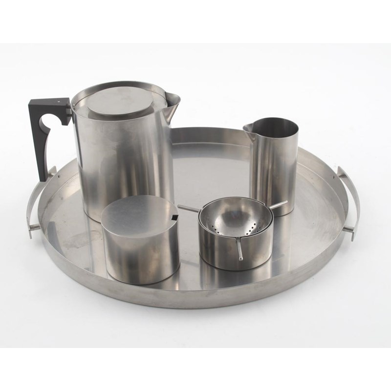 A Stelton Denmark, Cylinda Line stainless steel tea/coffee set designed by Arne Jacobsen, comprising; hot-water pot and cover, milk-jug, sugar basin and cover, strainer and stand on a twin-handled circular tray various factory marks, tray 35.5cm. diam, coffee pot 12.5cm. high