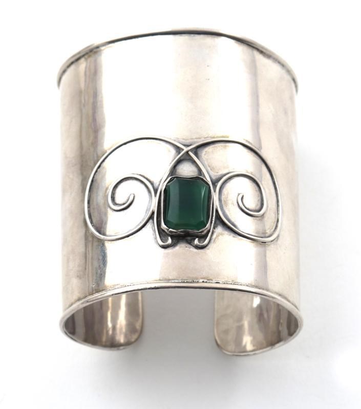 A rare H.G. Murphy silver bangle, with wirework decoration set with green chrysoprase stamped HGM mark London 1937 8cm. long