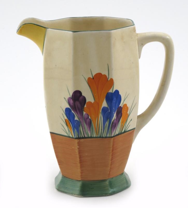 'Crocus' a Clarice Cliff Bizarre Athens jug, painted in colours above green and brown bands printed marks, 20cm. high