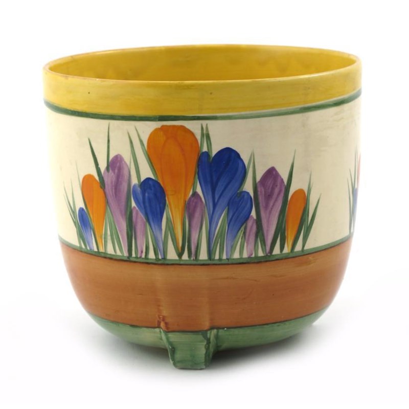 'Crocus' a Clarice Cliff Bizarre Dover jardiniere, painted in colours between yellow and brown bands printed and painted marks, star crack to base, minor overpainting to the top rim 17cm. high