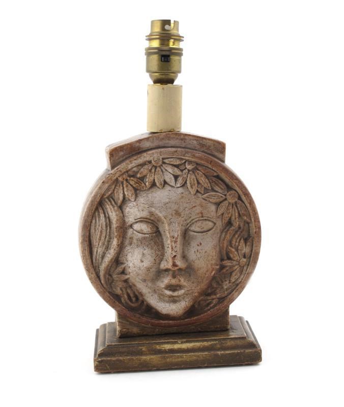 A pottery lampbase, circular form, cast in low relief with a stylised mask, painted in grey over ochre, on wooden base, chips, 29cm. high