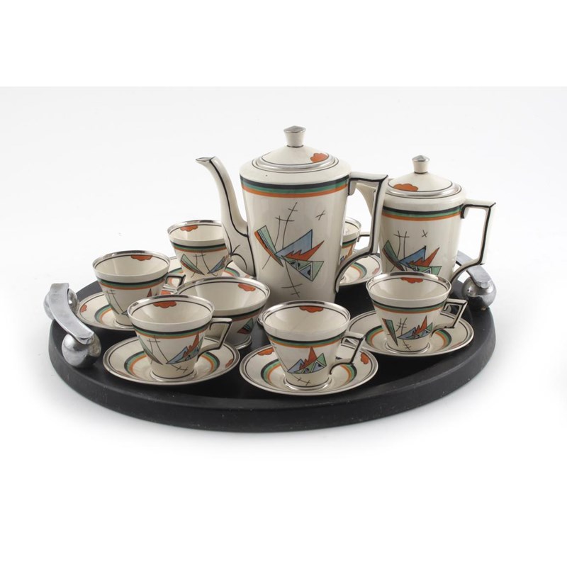 'Solent' a Corona Ware coffee set for six, printed and enamelled with geometric design in colours, comprising; coffee pot and cover, covered milk jug, sugar basin, six cans and saucers, on a circular tray, and a Myott Art Deco coffee set for six printed marks 18cm. high