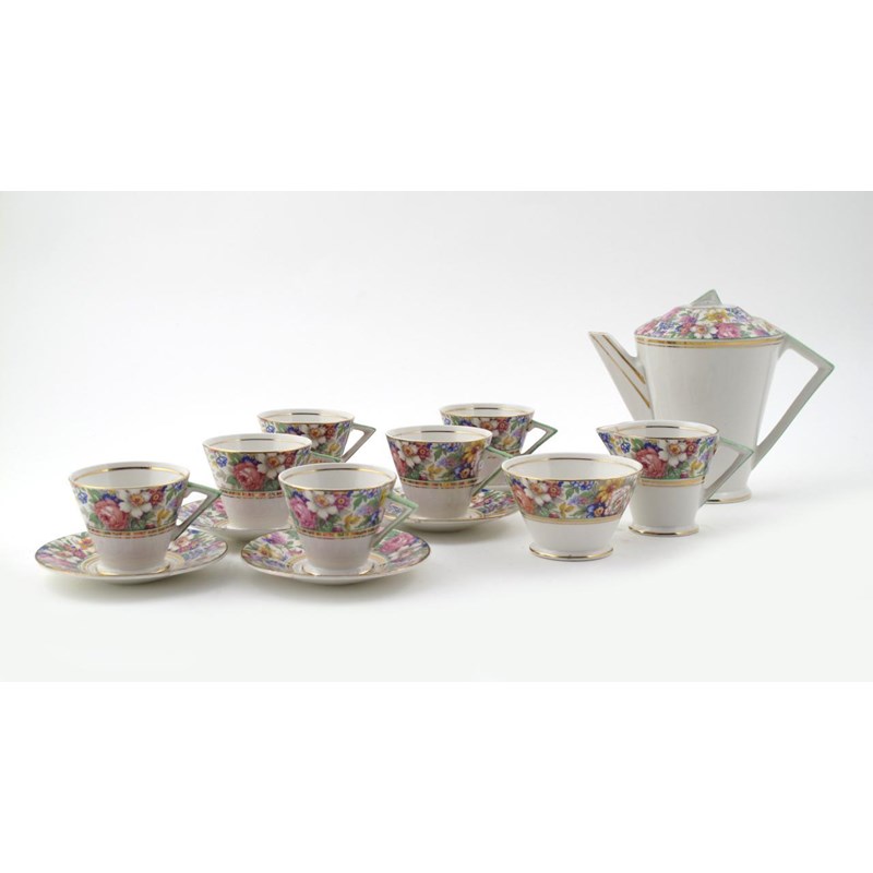 A Palissy chintz coffee set for six, model no.2910, printed in colours with dense floral transfers, comprising coffee pot and cover, milk-jug and sugar basin, six cups and saucers printed marks coffee pot 16cm. high