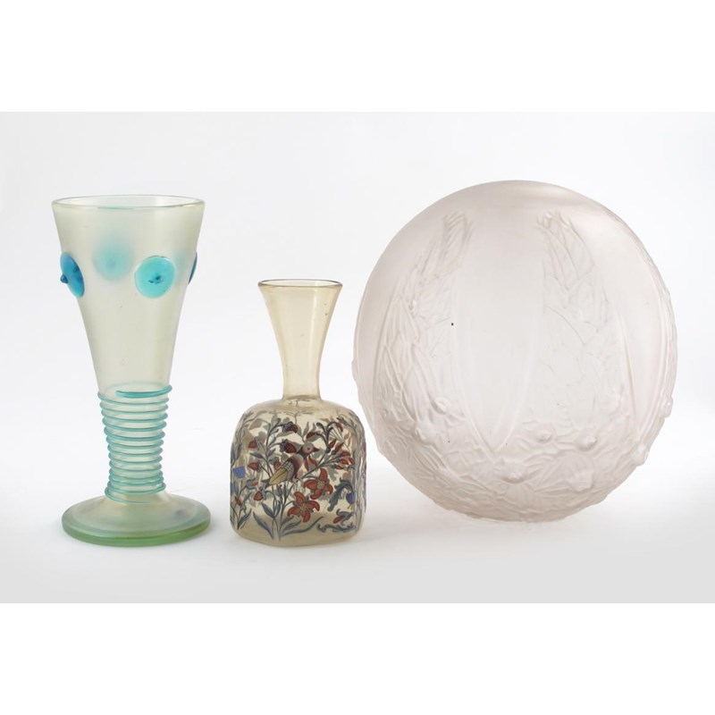 **** WITHDRAWN ****A moulded, frosted glass ball shade, moulded in relief with flowerhead panels, an iridescent glass vase and an enamelled glass vase unsigned shade 28cm. high