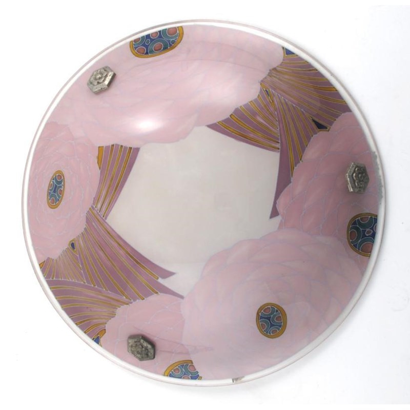 A Loys Lucha internally enamelled glass ceiling light, bowl shaped, decorated with geometric pink dahlia flowers, remains of hanging silk threads signed to the rim, 35.5cm. diam.