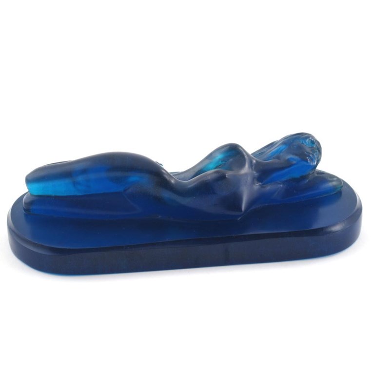 A sapphire blue glass figure of a woman, cast from a model by Charles Korschann, modelled lying on her side, on a rounded rectangular base, cast signature Charles Korschann, 24cm. wide