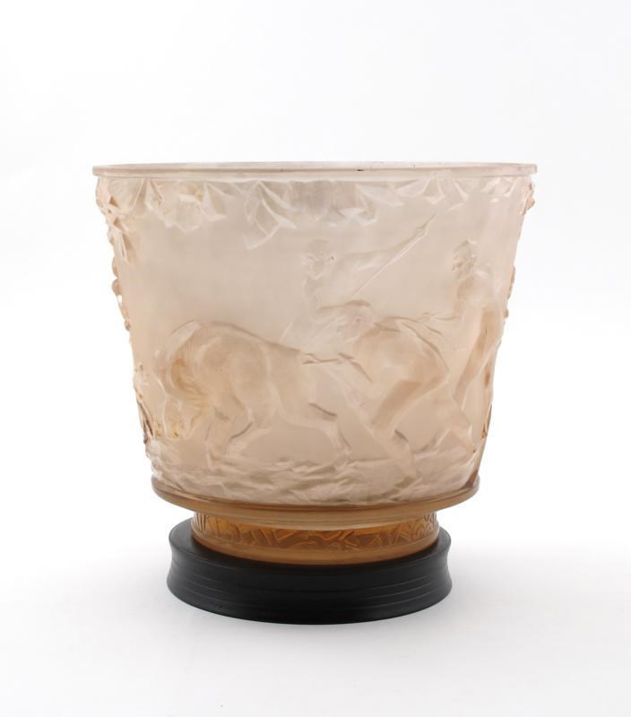 A Muller Freres footed glass vase, flaring cylindrical form, pale pink frosted and polished glass, modelled in relief with a boar hunt, with ebonised wood foot signed in the cast Muller Freres Luneville 22.5cm. high