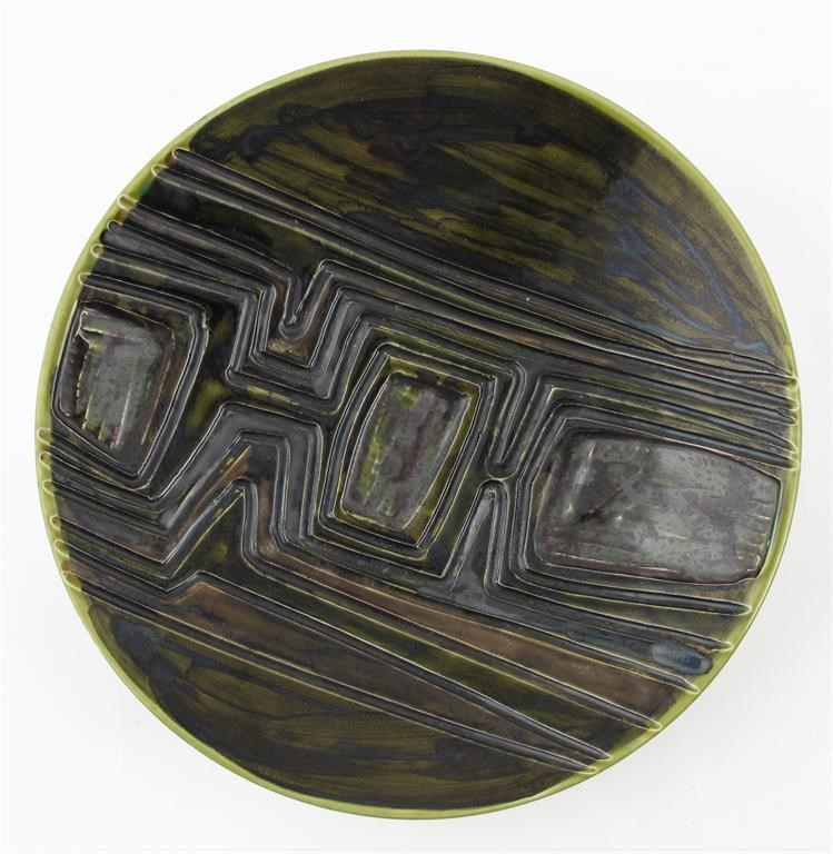 A Poole Pottery Delphis plate, shape no.4, with carved geometric design glazed olive printed and painted marks 26.5cm. diam.
