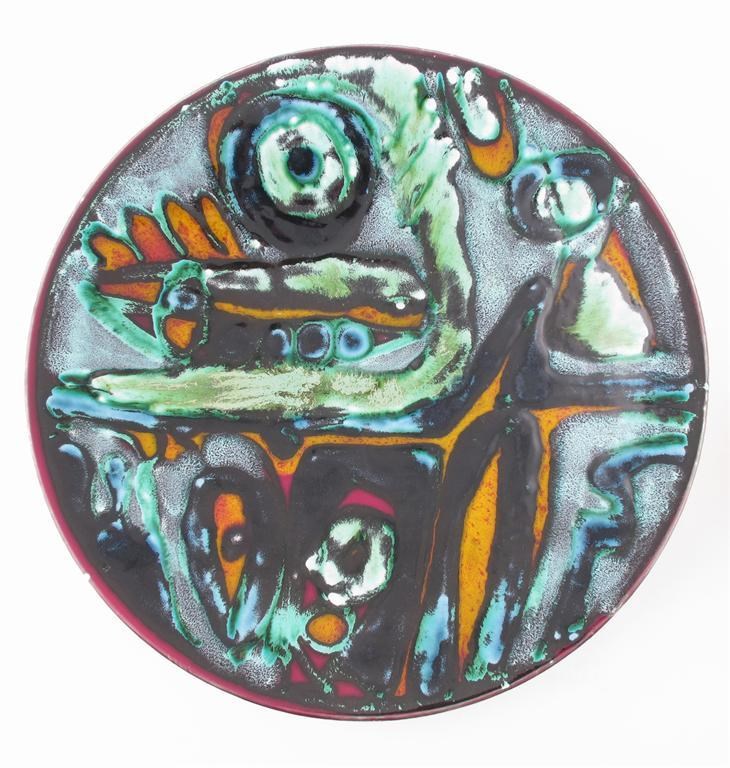 A Poole Pottery Delphis charger, shape no.54, painted with geometric design in blue, orange and red printed and painted marks 41cm. diam.